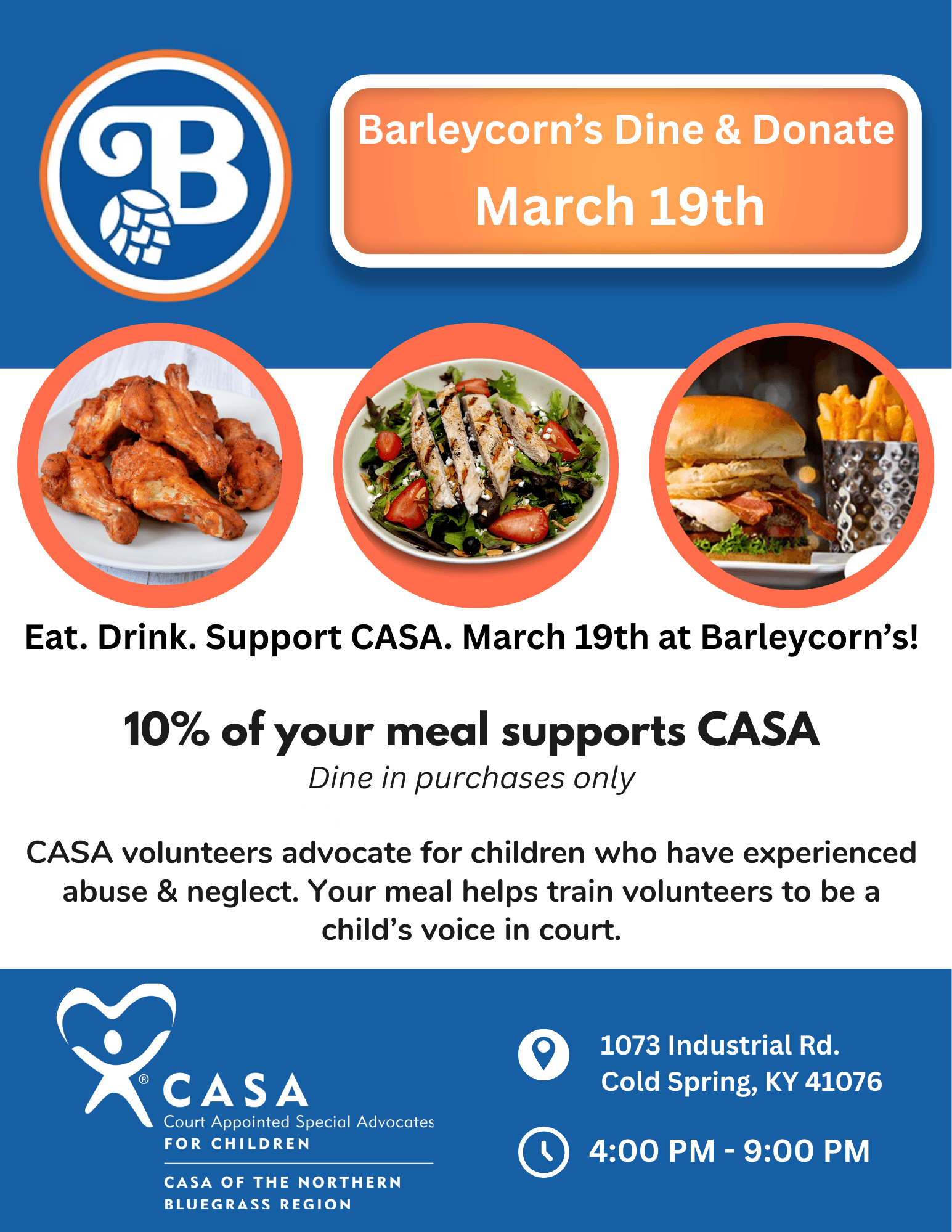 Join us at Barleycorn's in Cold Spring, KY for the beginning of March madness on Thursday, March 19th from 4-9pm. This is dine in only. Show the flyer to your server or print it to take with you. We appreciate your support!